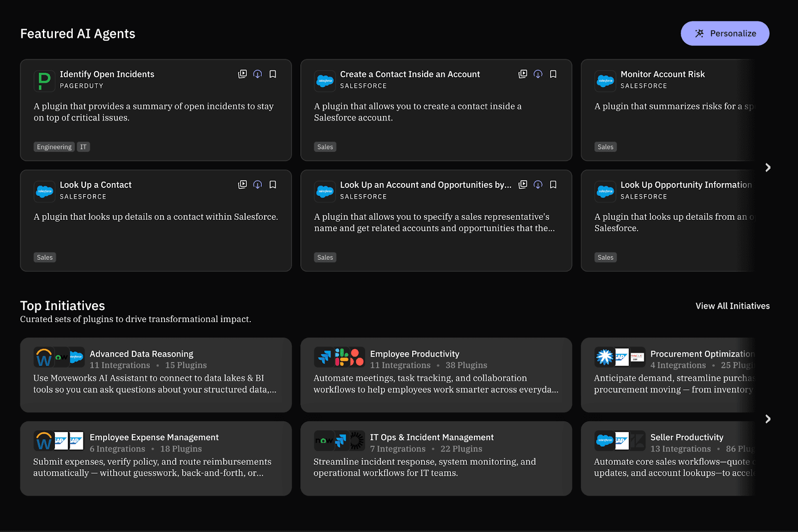 Moveworks scales through scoped assistant patterns and installable capabilities.