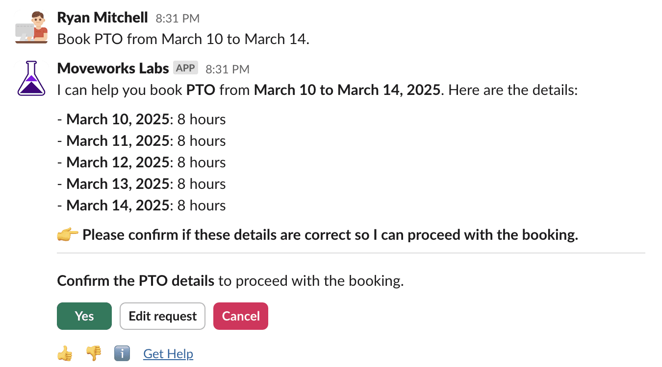 Moveworks, on the other hand, is closer to an enterprise employee assistant platform. Its focus is on giving employees a single front door to get help, ask policy questions, and complete common service tasks inside tools like Slack or Microsoft Teams. The platform is designed around support resolution, service workflows, and employee experience rather than broad operational automation.