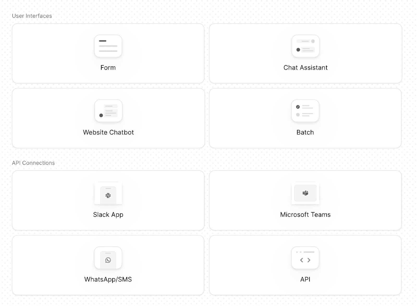 Deployment | How users access the system | ✅ Chat, forms, batch runs, widgets, bots, API endpoints | Slack, Teams, web, embedded via Headless API |