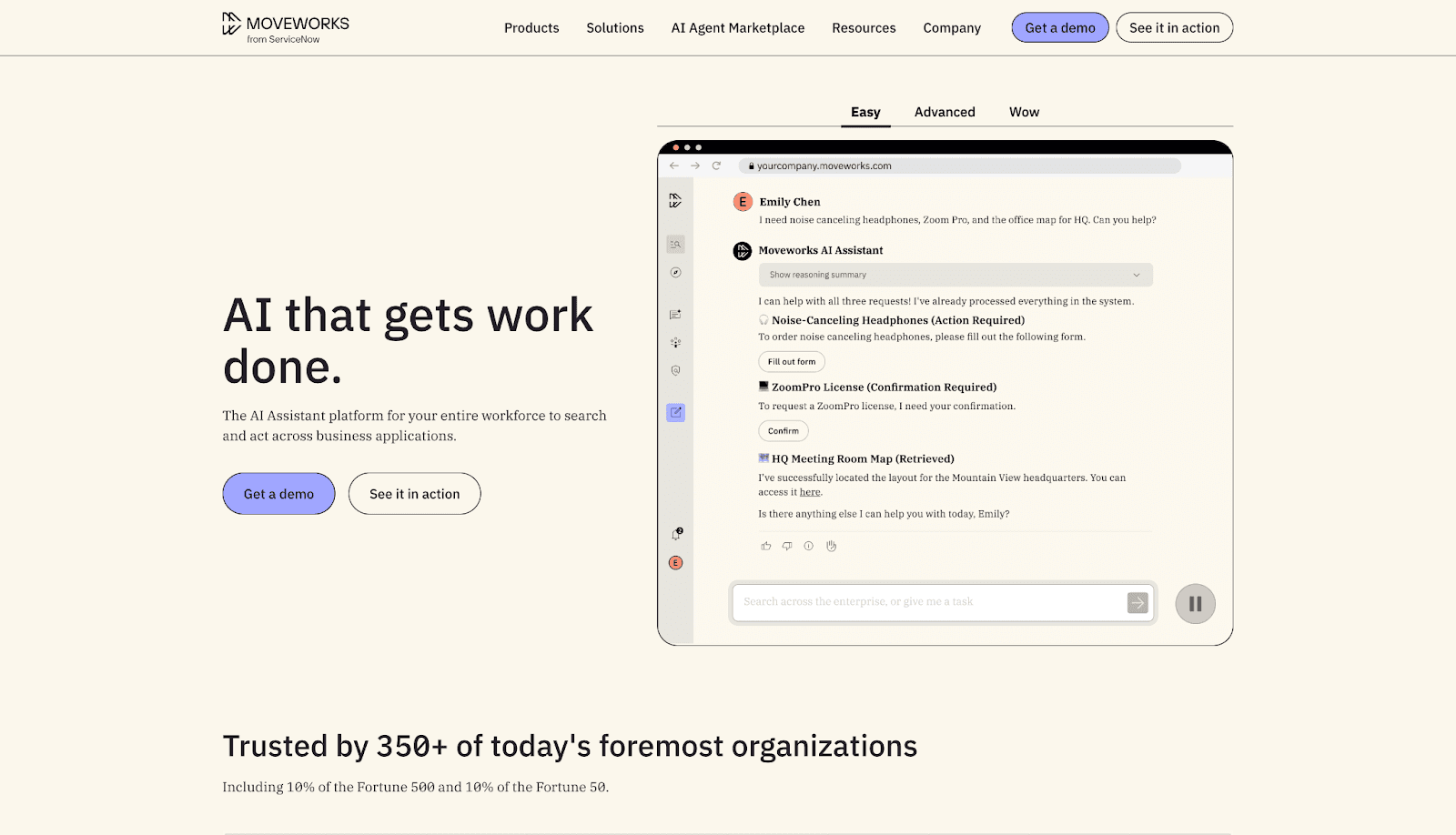 Moveworks focuses on one employee assistant experience across collaboration tools and portals.