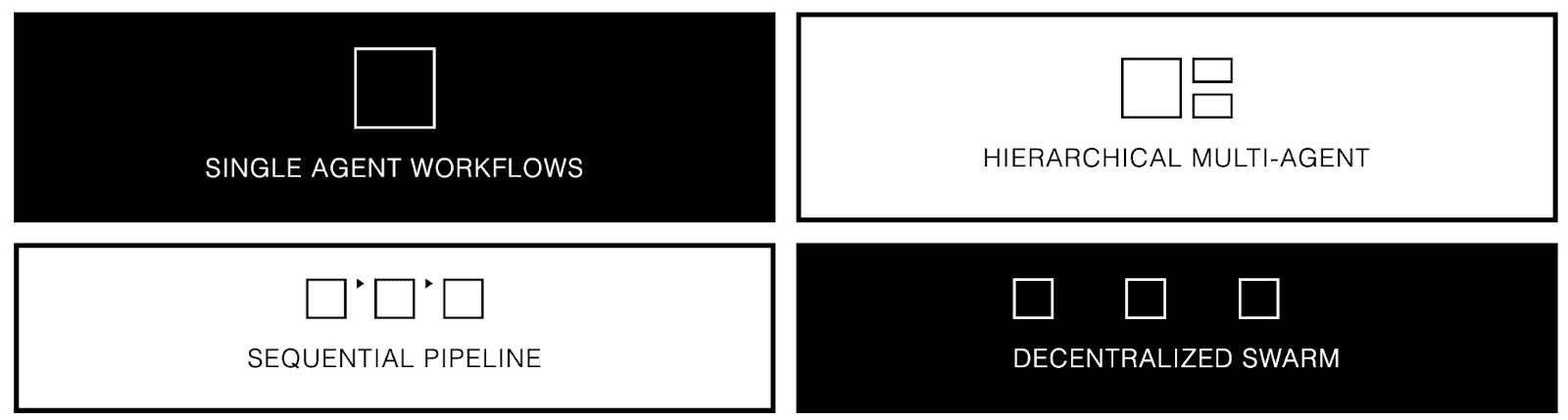 A lot of articles classify architectures by features like retrieval, memory, or tool use. Those features matter, but they are not the core structure. A single agent can use tools, retrieval, and memory. A multi agent system can do the same, with different agents having the same access or different access. For an internal taxonomy, it is often more practical to classify systems by workflow shape and control topology. This guide uses four categories: single agent workflows, hierarchical multi agent workflows, sequential pipeline workflows, and decentralized swarm workflows. Everything else is a capability you can add to any of them.