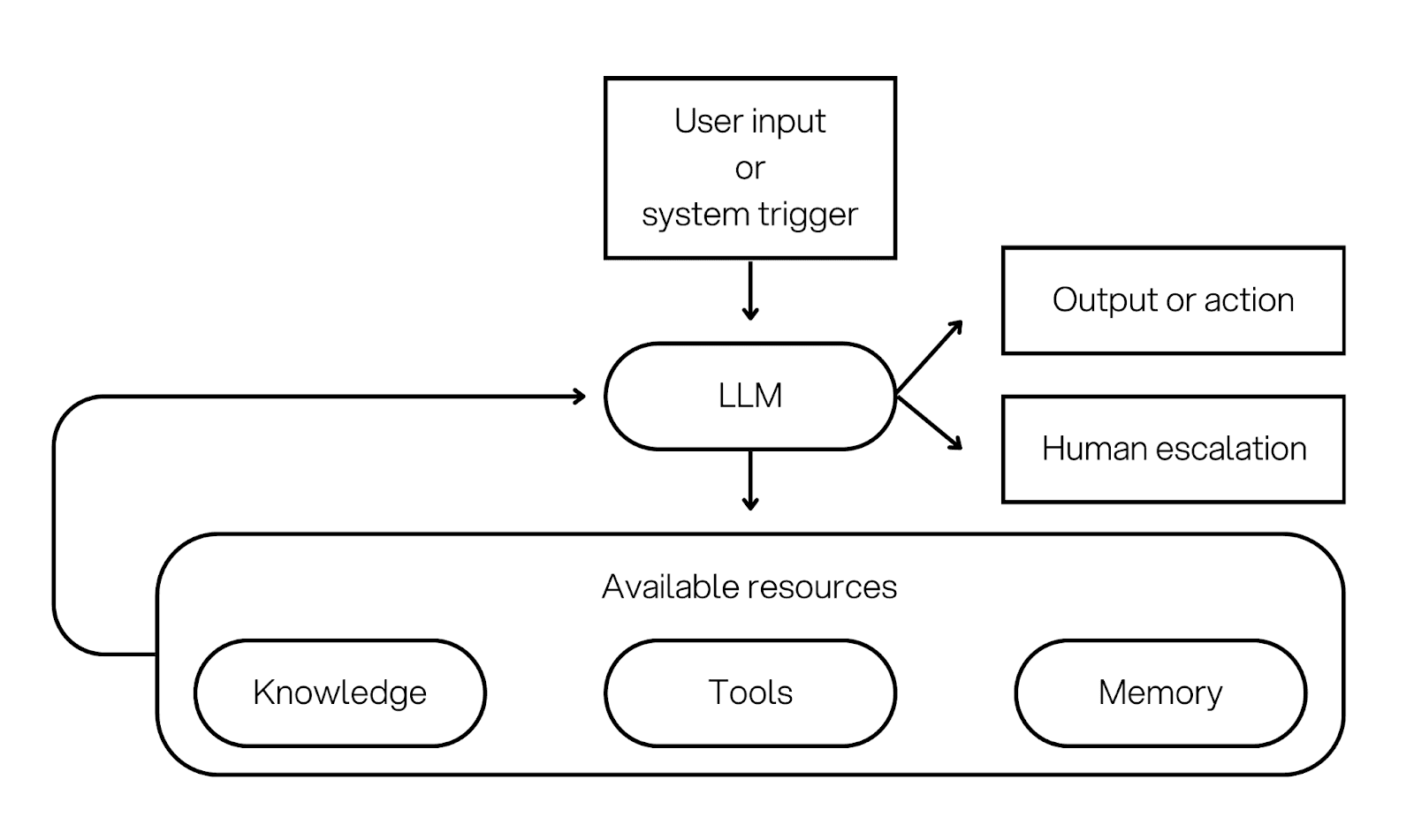 Architecture overview: The agent runs a loop. It reads the goal, picks a next step, and uses the resource layer to act. The loop continues until the agent finishes, asks a clarification question, or escalates.